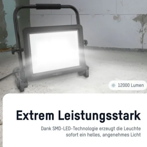 Durch den Einsatz der leistungsstarken SMD-LED-Technologie erzeugt die Leuchte ein intensives helles Licht. Die Leuchte kommt dabei auf eine Helligkeit bis zu 12.000 Lumen. Dank des breiten Abstrahlwinkels wird das helle Licht gleichmäßig verteilt, damit kleine Details ebenso wie große Flächen homogen ausgeleuchtet werden. Das Licht der LEDs hat eine Farbtemperatur von ca. 5000K, welche die Augen nicht zu sehr belastet. Das bedeutet ein angenehm natürliches, weißes Licht, das nicht ermüdet und ein entspanntes Arbeiten ermöglicht.
