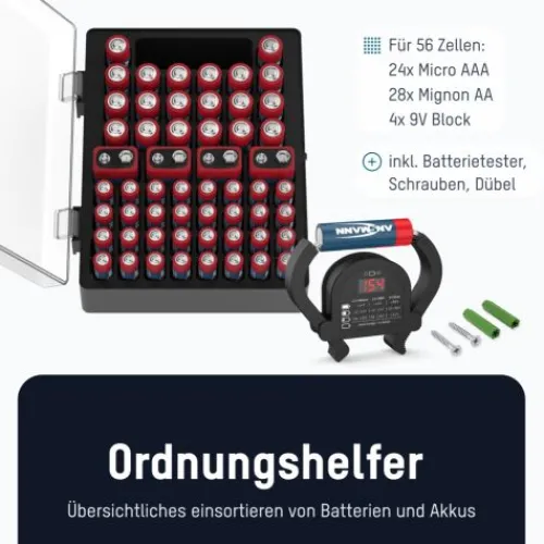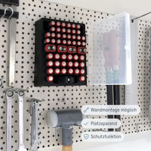 - Durch die übersichtliche Box sind immer alle Batterien aufgeräumt und sicher verstaut