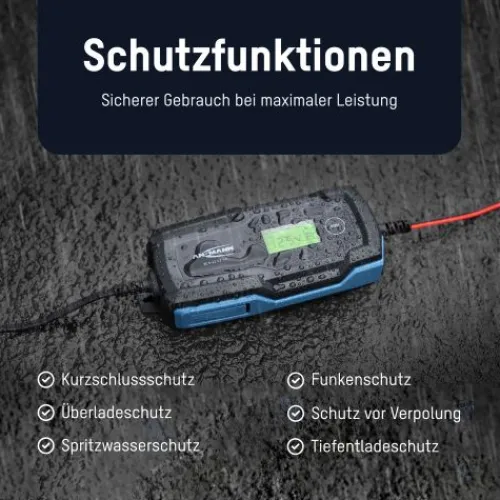 Das Ladegerät ist staub- und strahlwassergeschützt (IP65) und hat folgende elektrische Sicherheitsfeatures: Verpolschutz, Überladeschutz, Tiefentladeschutz und Kurzschlussschutz