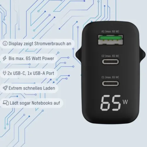 Das leistungsstarke Gerät lädt alle Ihre Anwendungen – vom Smartphone bis zum Notebook – ultra-schnell und zuverlässig! Durch die intelligente Ladesteuerung und Multisafe Technologie wird Ihre Anwendung optimiert und sicher geladen. Das LED Display infomiert jederzeit über den aktuellen Stromverbrauch aller angeschlossener USB-Geräte. Der sehr geringe Stand-by Verbrauch macht dieses Ladegerät nicht nur effizient, sondern auch ökonomisch.