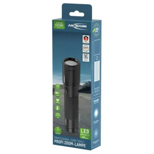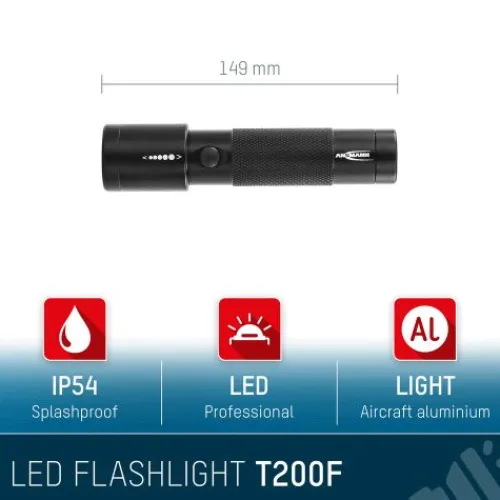 Die professionelle Taschenlampe FUTURE T200F von ANSMANN besticht durch ihre optimalen Gehäuseproportionen und griffige Oberfläche. Durch die Verwendung eines großen Schalters ist die Lampe ideal für den rauen Einsatz, auch im Einhandbetrieb oder mit Handschuhen.