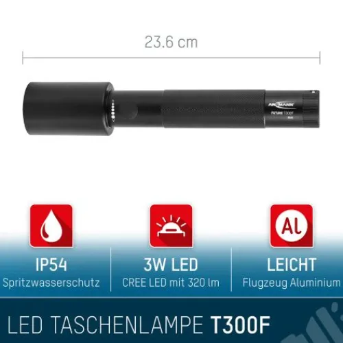 Die Hochleistungstaschenlampe Future T300F wurde speziell für anspruchsvolle Anwender konzipiert und ist erste Wahl für Polizisten, Sicherheitsdienste, Feuerwehrleute, Rettungskräfte oder Outdoor-Sportler. Die energiesparende und nahezu unzerstörbare Power-LED aus dem Hause CREE™ sorgt für eine enorme Helligkeit und Leuchtweite. Die abgesetzte Grifffläche und der große, gummierte Ein-/Ausschalter ermöglichen eine benutzerfreundliche Handhabung – auch mit Handschuhen oder bei Nässe.