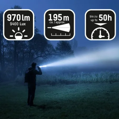Die Hochleistungstaschenlampe Future T500F wurde speziell für anspruchsvolle Anwender konzipiert und ist erste Wahl für Polizisten, Sicherheitsdienste, Feuerwehrleute, Rettungskräfte oder Outdoor-Sportler. Die energiesparende und nahezu unzerstörbare Power-LED aus dem Hause CREE™ sorgt für eine enorme Helligkeit und Leuchtweite. Die abgesetzte Grifffläche und der große, gummierte Ein-/Ausschalter ermöglichen eine benutzerfreundliche Handhabung – auch mit Handschuhen oder bei Nässe.