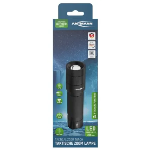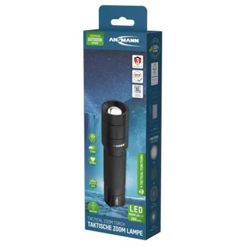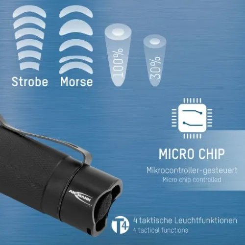 Die professionelle Taschenlampe M250F von ANSMANN besticht durch ihre optimalen Gehäuseproportionen und griffige Oberfläche. In Verbindung mit dem mikrokontrollergesteuerten Endkappenschalter ist die M250F für taktische Einsatzgebiete geeignet und erlaubt im Betrieb das Schalten der drei Leuchtfunktionen 100% Leuchtkraft, 30% Leuchtkraft oder Stroboskoplicht durch leichtes Antippen des Schaltknopfes. Des weiteren ist das lautlose Morsen im noch ausgeschalteten Zustand der Leuchte möglich. Durch die robuste und sehr griffige Gehäuseoberfläche ist die Taschenlampe M250F ideal für den rauen Einsatz, auch im Einhandbetrieb oder mit Handschuhen.