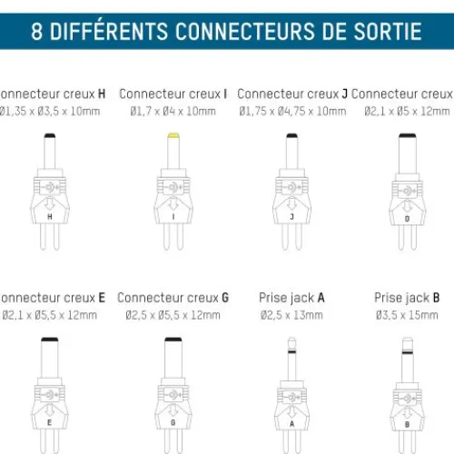 Im Lieferumfang sind ein Adapterkabel mit Tamiya Buchse sowie 8 handelsübliche Ausgangsstecker für den Anschluss am Polaritätswechsler enthalten.
