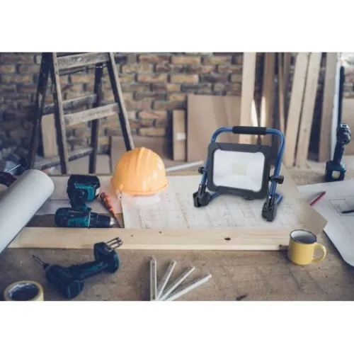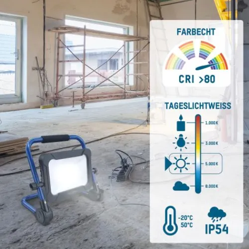 Das robuste und stoßfeste Gehäuse ist besonders widerstandsfähig gegen mechanische Beanspruchung. Dank IP54 ist die Leuchte vollständig gegen Fremdkörper (Staub), Berührungen und Strahlwasser aus einem beliebigen Winkel geschützt. Somit können Sie sich bei optimaler Ausleuchtung im Innen- und Außenbereich voll auf Ihre Arbeit konzentrieren.