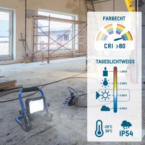 Das robuste und stoßfeste Gehäuse ist besonders widerstandsfähig gegen mechanische Beanspruchung. Dank IP54 ist die Leuchte vollständig gegen Fremdkörper (Staub), Berührungen und Strahlwasser aus einem beliebigen Winkel geschützt. Somit können Sie sich bei optimaler Ausleuchtung im Innen- und Außenbereich voll auf Ihre Arbeit konzentrieren.