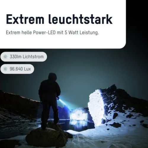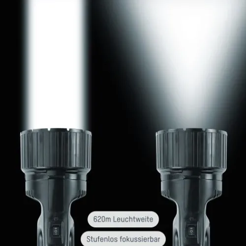 Als Lichtquelle dient eine extrem helle Power-LED mit 5 Watt Leistung. In Verbindung mit dem hocheffizienten und fokussierbaren Reflektorsystem werden so – je nach Leuchtmodus – Leuchtweiten bis zu 620 Meter erreicht.