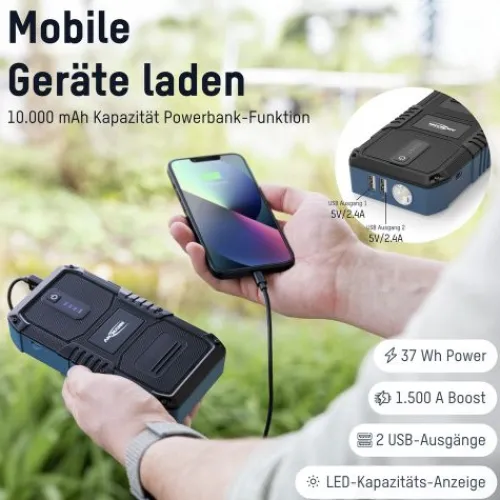 Mit diesem kompakten, aber leistungsstarken Jumpstarter kann eine schwache 12V Fahrzeugbatterie (z.B. von Auto, Motorrad oder Boot) in Sekundenschnelle überbrückt und dann der Motor gestartet werden.