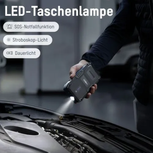 Das Gerät ist nicht nur als Starthilfe für ein Kfz, sondern auch als tragbare Powerbank und LED-Taschenlampe mit 3 Funktionen einsetzbar (Dauerlicht / Stroboskop-Licht / SOS-Licht).