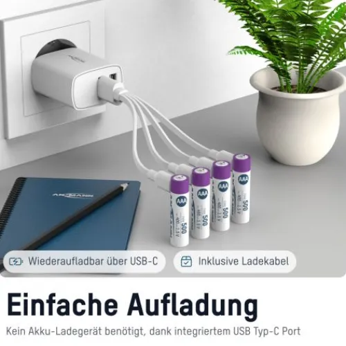 Aufgrund des integrierten USB-C Ladeports sind keine zusätzlichen Ladegeräte notwendig! Für jede Größe ist das passende USB-C Kabel in der Lieferung enthalten. Hiermit können 4 Micro AAA Akkus zeitgleich mit nur einem Kabel geladen werden. Dadurch garantieren wir sicheres und einfaches Aufladen über alle verfügbaren USB-Lademöglichkeiten wie Laptop, Powerbank, USB-Ladegerät für die Steckdose oder Auto oder integrierte USB Ladegeräte in der Wand oder im Auto. Die Anzeige am Pluspol des Akkus blinkt während des Ladevorgangs. Sobald die Ladung vollständig ist, leuchtet diese dauerhaft.