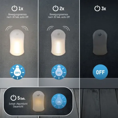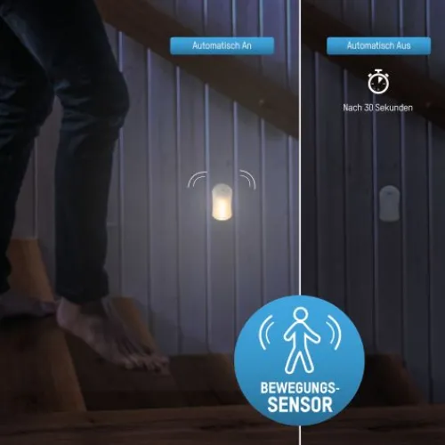 Das kleine und handliche Nachtlicht ist jederzeit einsetzbar und wird mit drei Micro AAA Batterien betrieben. Für eine gute nächtliche Orientierung sorgt der integrierte Dämmerungs- und Bewegungssensor.