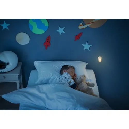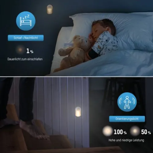- Mit eingebautem Schalter zur Wahl der Leuchtfunktionen Orientierungslicht und Nacht-/Schlaflicht