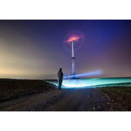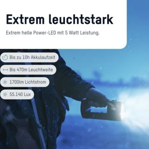 Bei der Funktion, in der alle LEDs leuchten, erreicht die Lampe bis zu 1700 Lumen bei einer Leuchtweite bis zu 470 Metern.