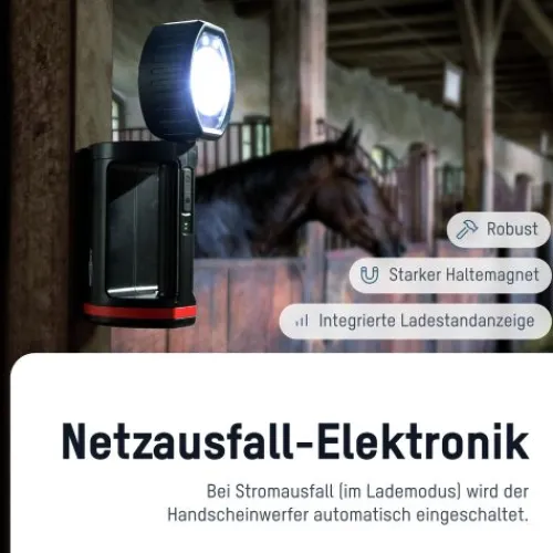 Bei Stromausfall (im Lademodus) wird der Handscheinwerfer automatisch eingeschaltet, somit ist mit der Lampe immer eine Notbeleuchtung vorhanden.