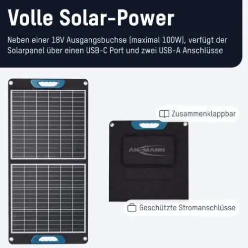 Das ANSMANN Solar Panel ist die ideale Ergänzung der Stromversorgung für draußen und unterwegs, insbesondere für alle Anwender, die gerne in der Natur unterwegs sind. Ob im Caravan, beim Angelausflug, im Gartenhaus oder auf der Baustelle – sobald die Sonne scheint, liefert das Panel zuverlässig Strom! Es ist die ideale Ergänzung zu Powerstations und Powerbanks und steigert die Unabhängigkeit vom Stromnetz. Die Solarzelle besteht aus monokristallinem Silizium und hat einen Wirkungsgrad von ca. 23%.