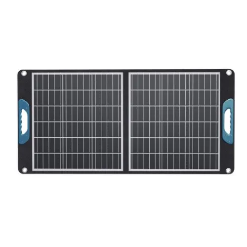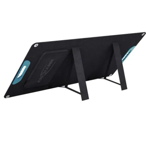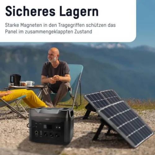 Zur idealen Ausrichtung in die Sonne sind zwei ausklappbare Aufstellfüße integriert. Zusätzlich gibt es in den Ecken Metallringe für weitere Befestigungsmöglichkeiten und Sicherung. In den robusten Kunststoff Tragegriffen sind Magnete integriert, welche das Panel im zusammengeklappten Zustand sicher gegen unbeabsichtigtes Aufklappen zusammenhalten. Das Panel ist gut gegen Spritzwasser und Regen geschützt (IP54), kann deshalb auch unbeaufsichtigt im Außenbereich aufgestellt bleiben. Im Lieferumfang enthalten ist ein 2m langes Anschlusskabel mit DC5521 Hohlsteckern, Adapterstecker 7,9 mm x 5,5 mm, Adapterstecker 5,5mm x 2,5 mm, Adapterstecker 3.5mm × 1.35 mm