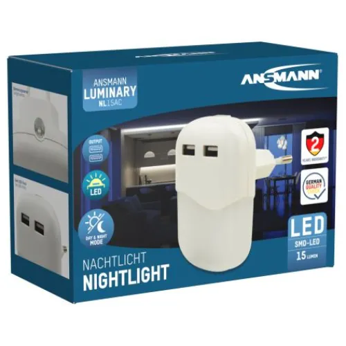 Das ANSMANN LED-Orientierungslicht NL15AC + 2USB mit integriertem Dämmerungssensor und 2× USB Ausgang sorgt für eine ausreichende Helligkeit im Dunkeln und das Laden von anderen Endgeräten. Die warmweiße SMD-LED sorgen für eine homogene und leichte Ausleuchtung. Das steckerbetriebene Nachtlicht, im ansprechenden Gehäusedesign, ist klein, leicht und handlich. Durch den integrierten Dämmerungssensor im Gehäuse aktiviert bzw. deaktiviert sich das Nachtlicht bei Dämmerung selbstständig. Eine leichte nächtliche Orientierung ist dadurch jederzeit gewährleistet. Daher ist es als Orientierungslicht z. B. auf Gängen und in Garagen oder Treppenhäusern und am Nachttisch bestens geeignet.